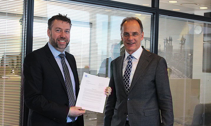 Morten A. Jensen, Sales & Marketing Manager at Lloyd's Register (left) handing over the statement of fact to Ulrich Schittek, Head of Management Services, After Sales, at Maersk Tankers (right)