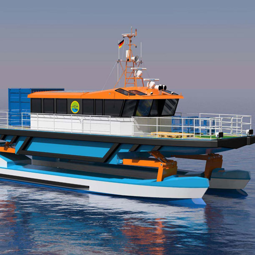 The suspension system allows the comparatively small vessel to withstand significant wave heights as well as transport crewmembers to and from offshore wind parks. The demonstrator currently under development is designed as a crew transfer vessel seating 31 persons including 2 crew members. As the suspension system can buffer the impact of even large waves, the passengers will be subjected to less motion and g‑forces during transit. This reduces the risk of seasickness and number of accidents, even in harsh weather, making crew transfers safer and more reliable. The vessel’s heated walkways and handrails can also improve safety in adverse conditions.